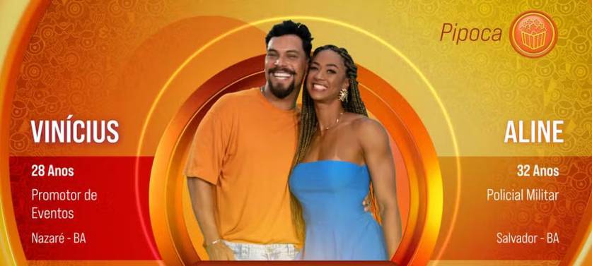 Os melhores amigos Aline e Vinicius foram a quarta dupla confirmada no BBB 25, no grupo Pipoca. Aline, de 32 anos, é policial militar em Salvador, enquanto Vinicius, natural de Nazaré, também na Bahia, trabalha como promotor de eventos.